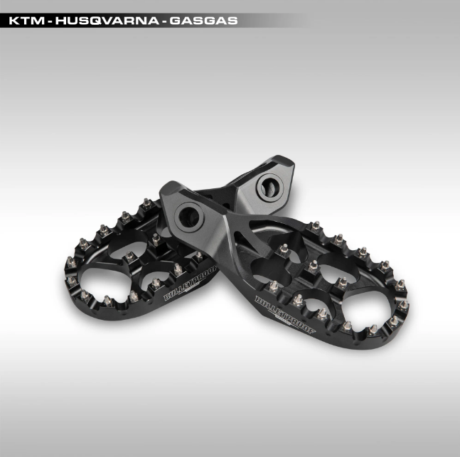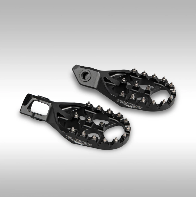 Our all new Bullet Proof Designs footpegs machined out of Billet 7075 Aluminum are a great upgrade from the stock footpegs that come with your bike at purchase. Wider than stock, sharp stainless steel pins, and wide grooves allow minimal mud buildup, excellent boot grip and a clean great looking design. Our footpegs come with spare footbed pins.